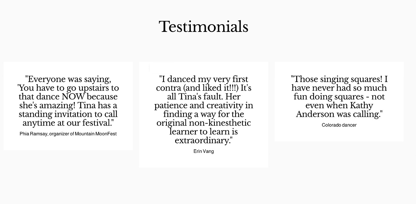 More info, including her current calling calendar, some testimonials and history, more videos, and links to her articles about traditional American dance can be found directly below.